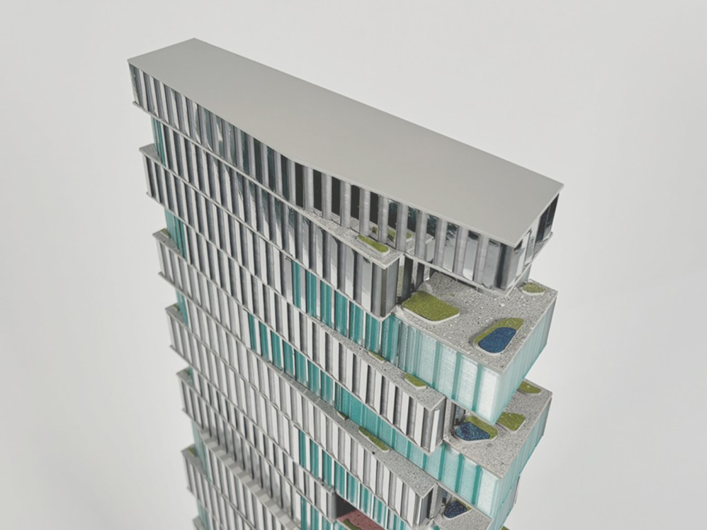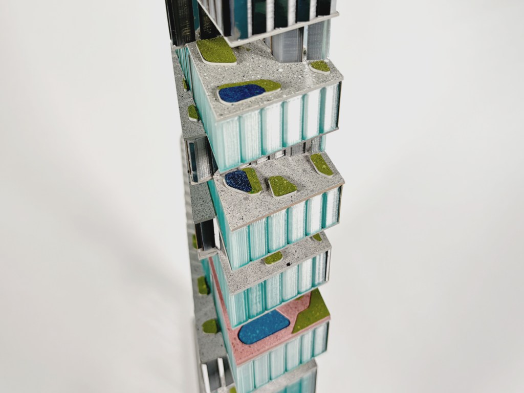 To achieve this, we constructed the model floor by floor, stacking them around two stabilizing cores. By isolating key components - aluminum, glass and slabs - we were able to give each element the necessary attention and precision. The horizontal slabs were laser-cut and painted to match the design's colors. Combined with the different outdoor spaces, their materials and textures break up the vertical mass, as envisioned by the architect.