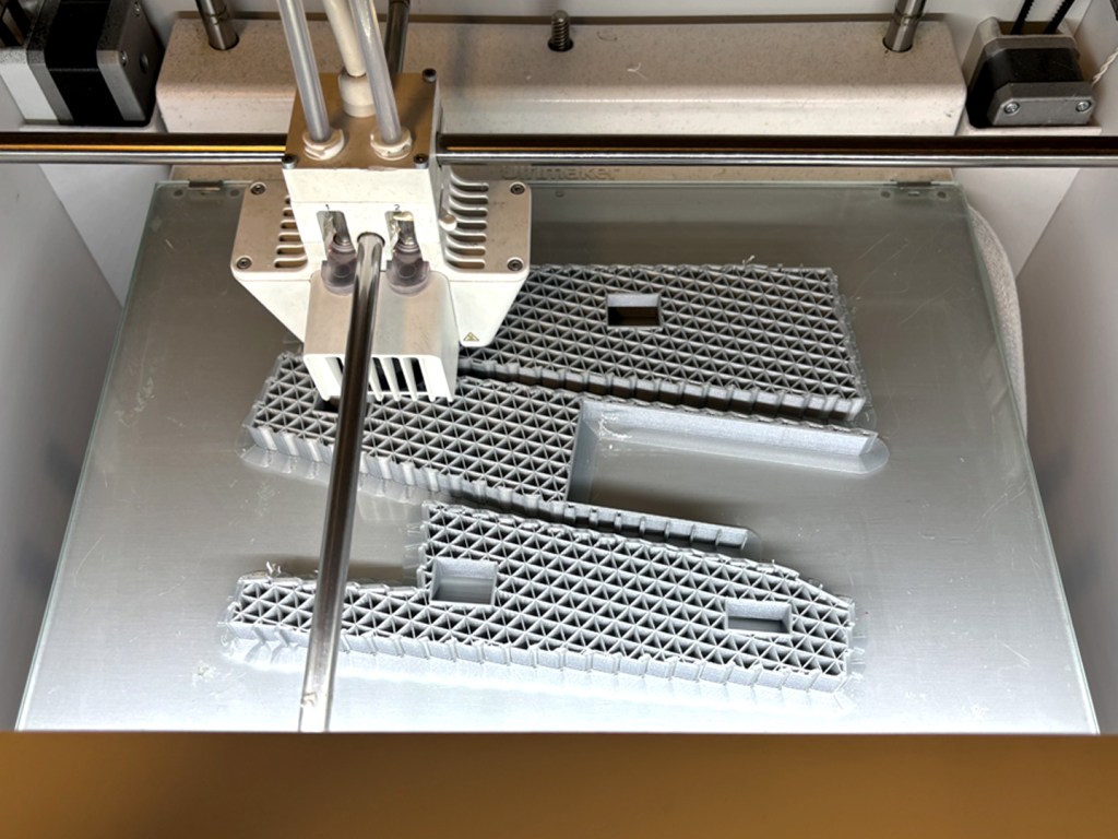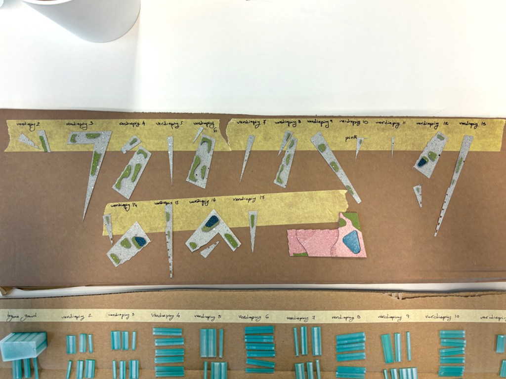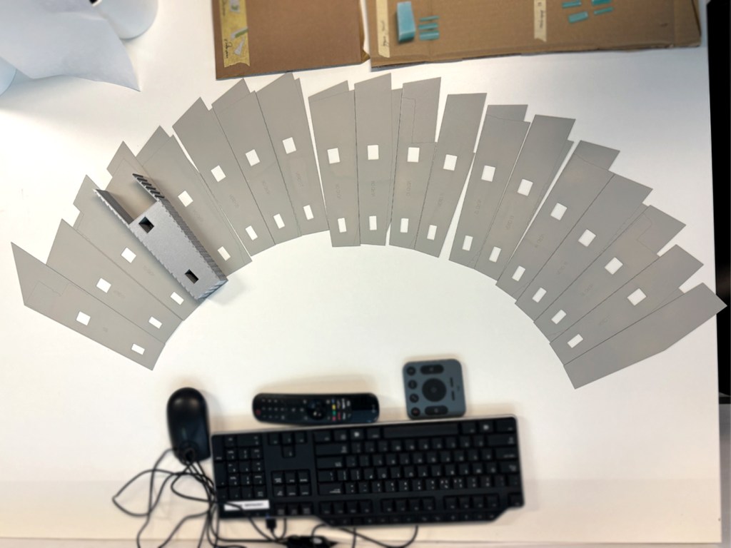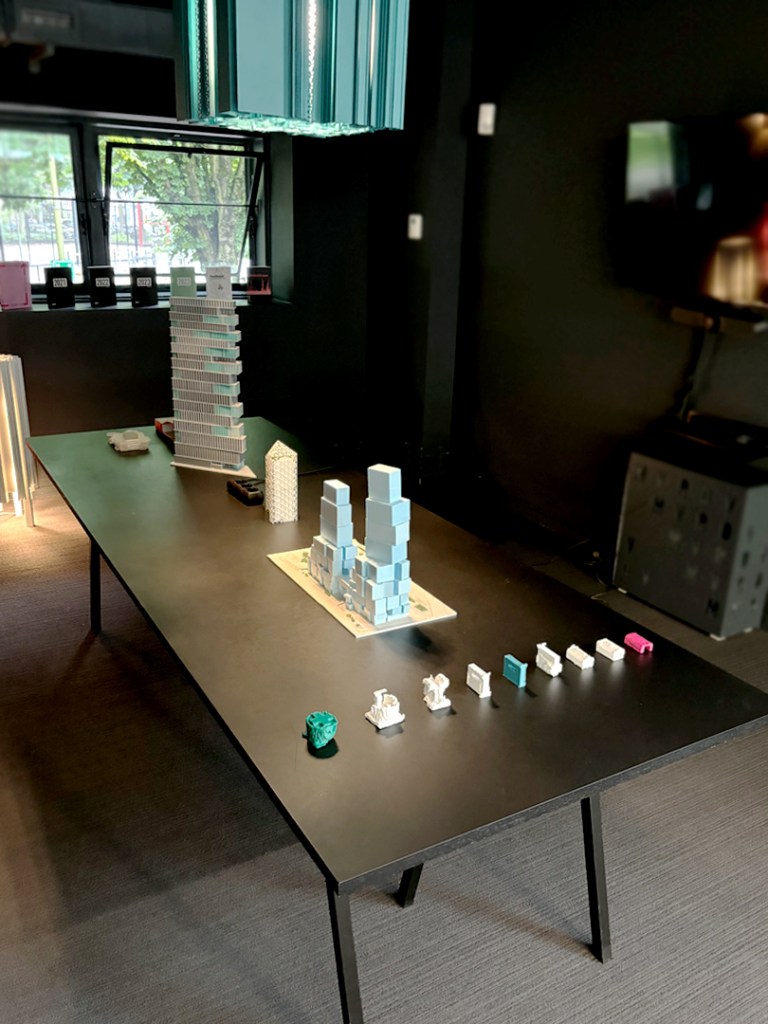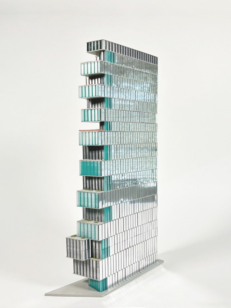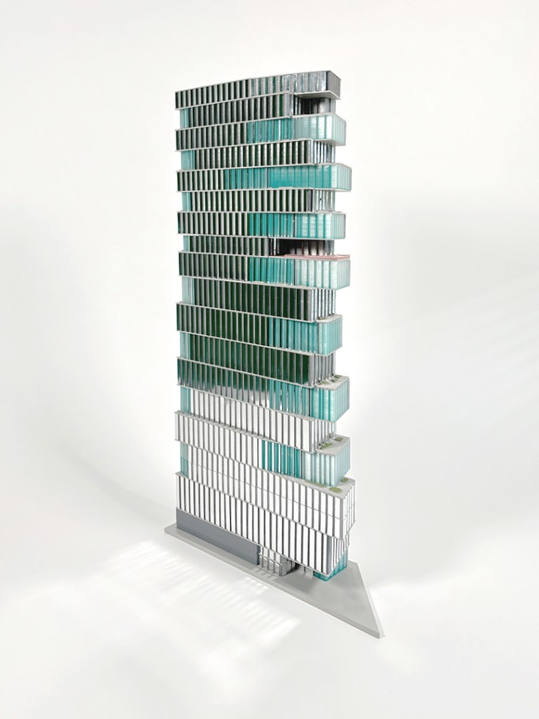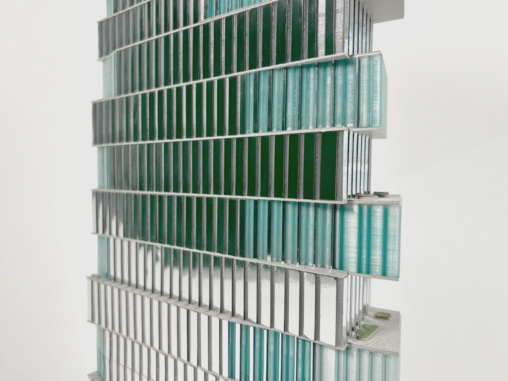 Simplified 3D-printed volumes on top of these slabs represent each floor, capturing the intended shape and ripple effect. The aluminum panels were individually cut and placed to create a reflective, unified surface that reads as distinct panes, while the blue glass facade was carefully tinted in the correct tone to achieve the right balance of transparency and color. This approach highlights the facade’s striking blue hue while maintaining focus on the overall building mass.
