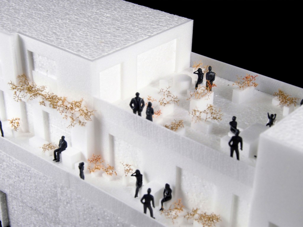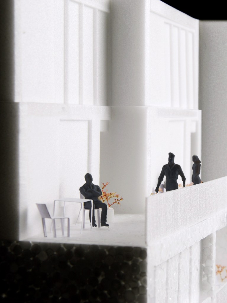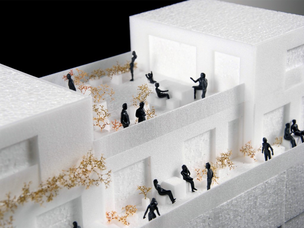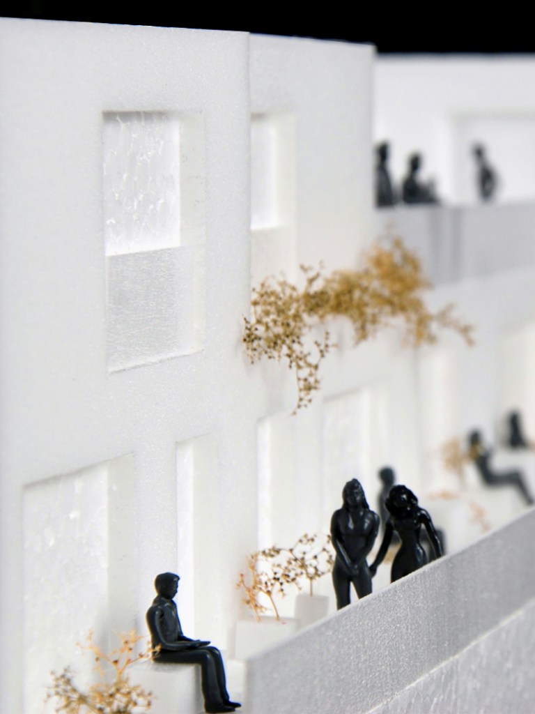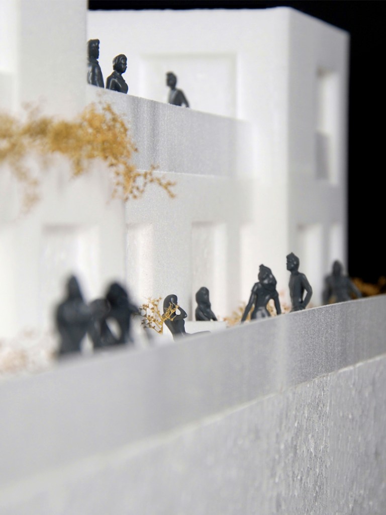 The housing block designed by MORE Architecture consists of six distinct typologies. On the plinth level they foster active interactions with the street, while on the upper 'Land' layer, terraces and exterior galleries allow both visual and physical connections between neighbors. This model highlights not only the architectural aspects of the design, but also the social possibilities and dynamics it proposes. By abstracting the volume and materialization, we emphasize the terraces and the 'elevated street' concepts, which are in the core of the project. The exaggeration of people and greenery is to clearly demonstrate how the design encourages informal interactions among residents, both on the terraces and within the exterior galleries.